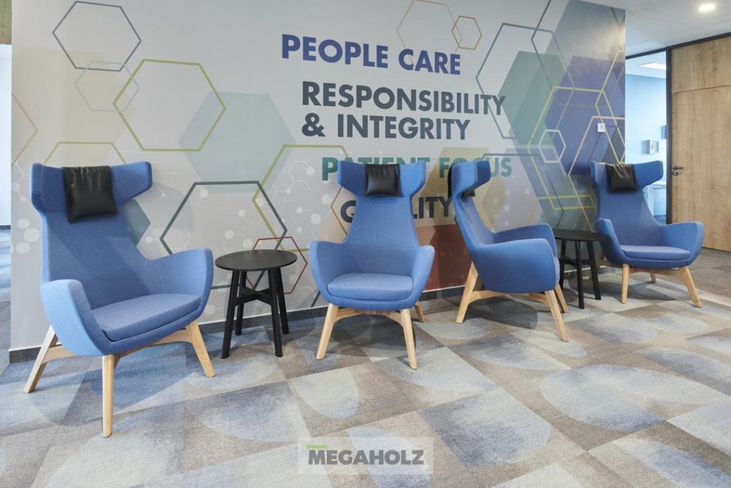 Az egészségközpont belső tereinek kialakításában a Megaholz csapata is részt vett, kiemelt figyelmet fordítva a páciensek és irodisták kényelmére és