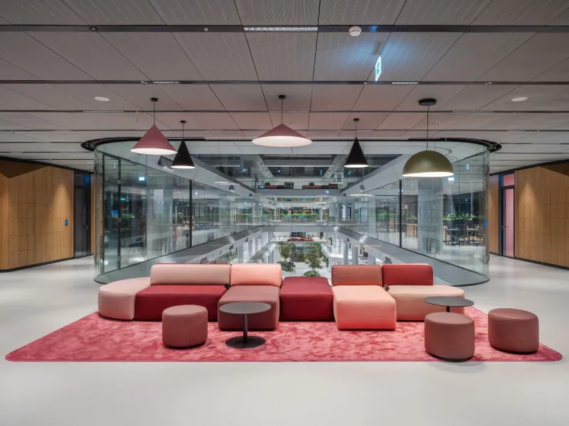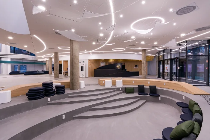 A MOL Campus épületére impozáns külseje mellett kiemelt figyelmet fordítottak a belső térre is. A Megaholz szállította a közösségi terek