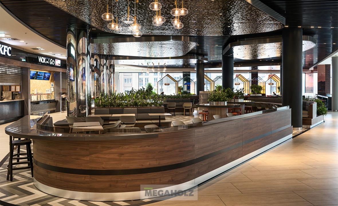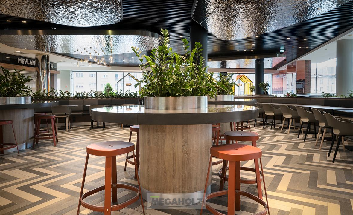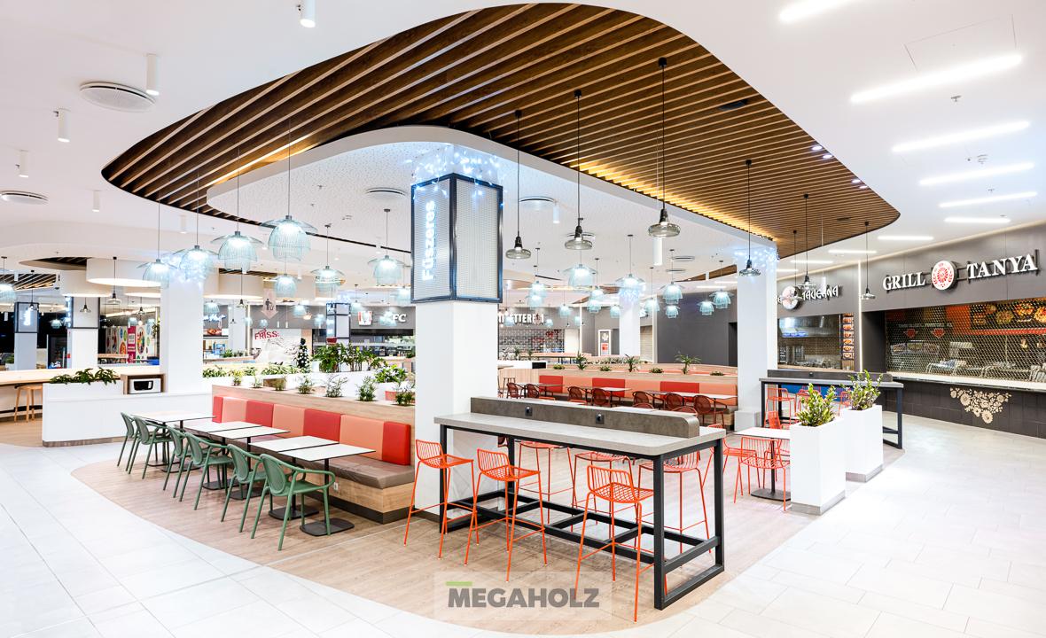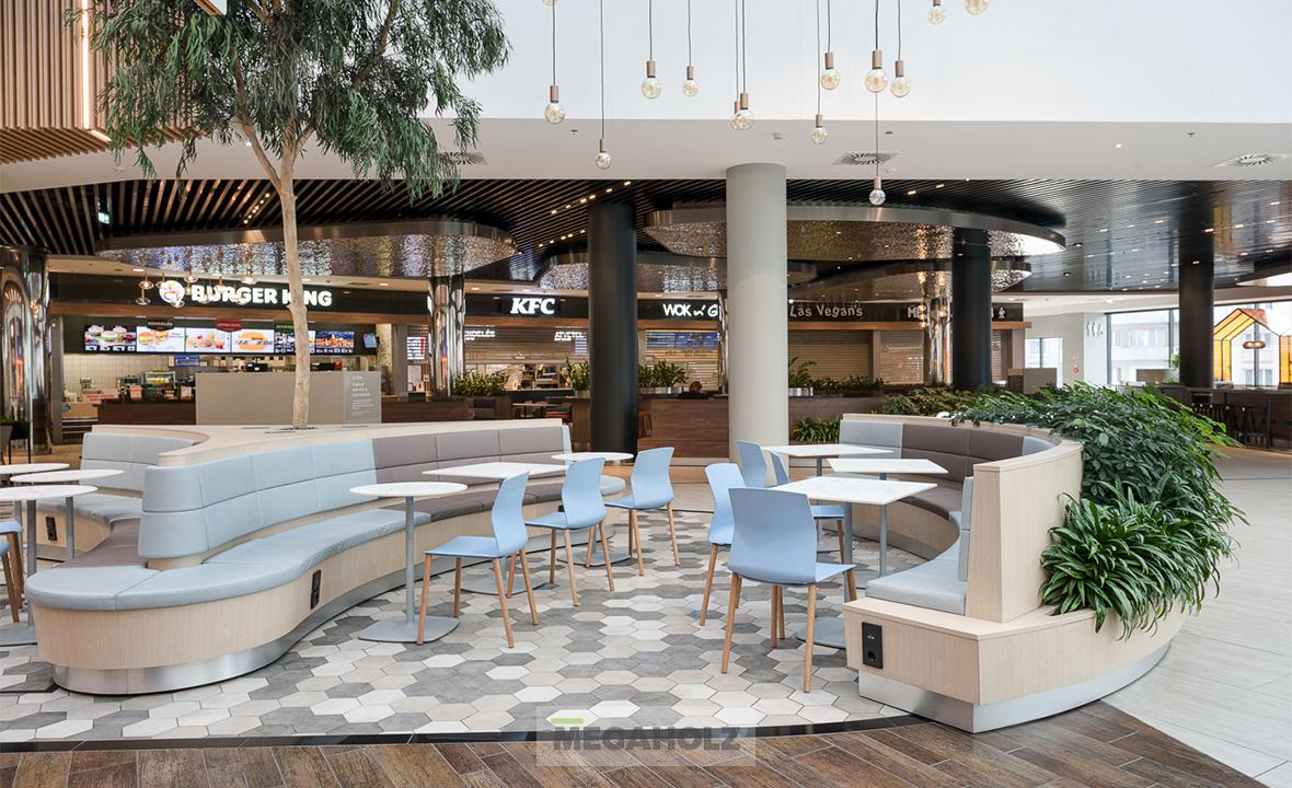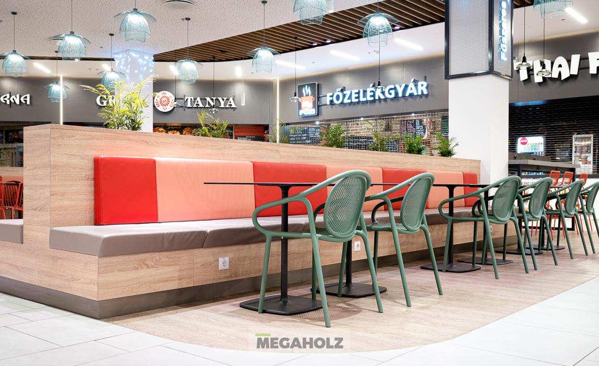 Az Allee étteremudvarának felújításában a Megaholz csapata is részt vett. Az udvar stílusos külsőt kapott, nem beszélve a különböző design elemekről. A Megaholz szállította az egyedileg gyártott kárpitozott leülőket, etetőpultokat valamint a különleges narancssárga plexi és fém ülőkuckókat.