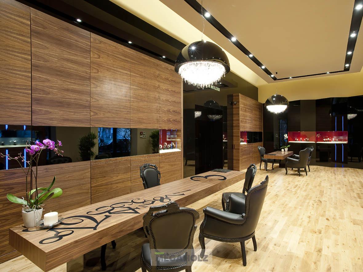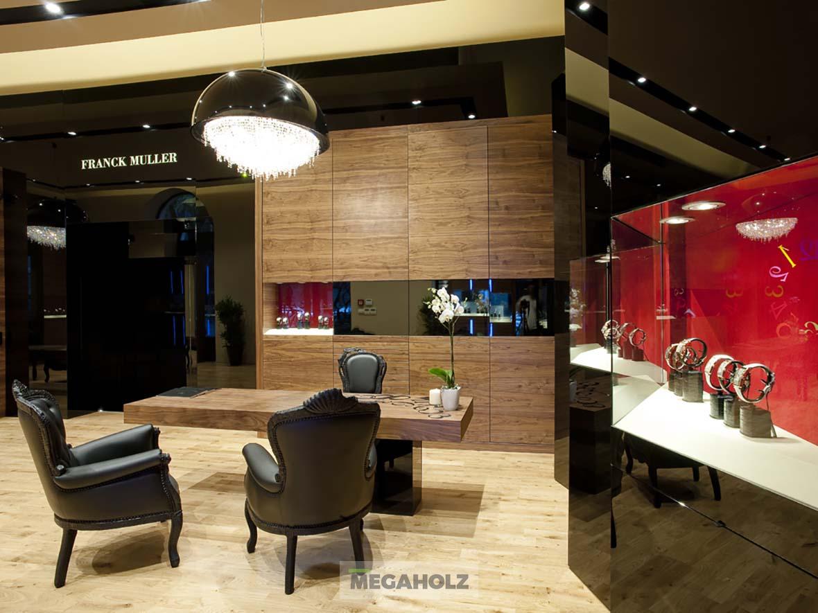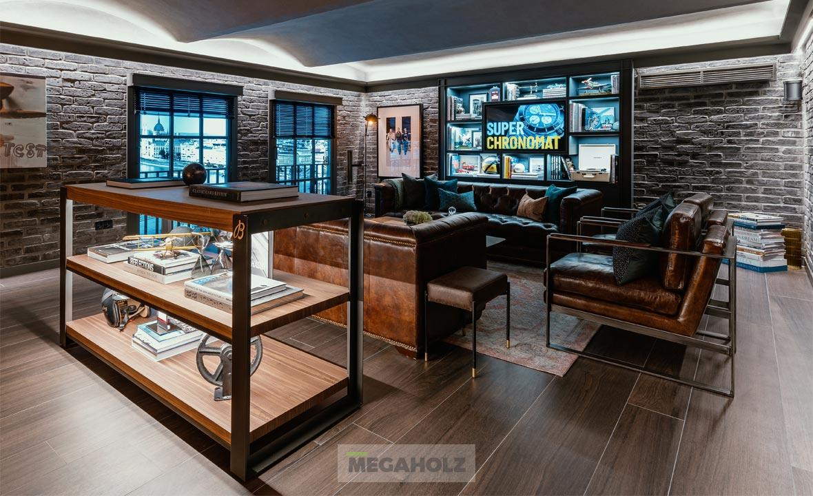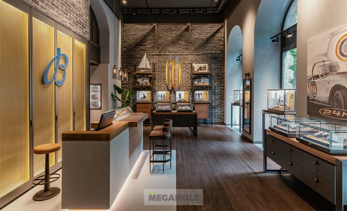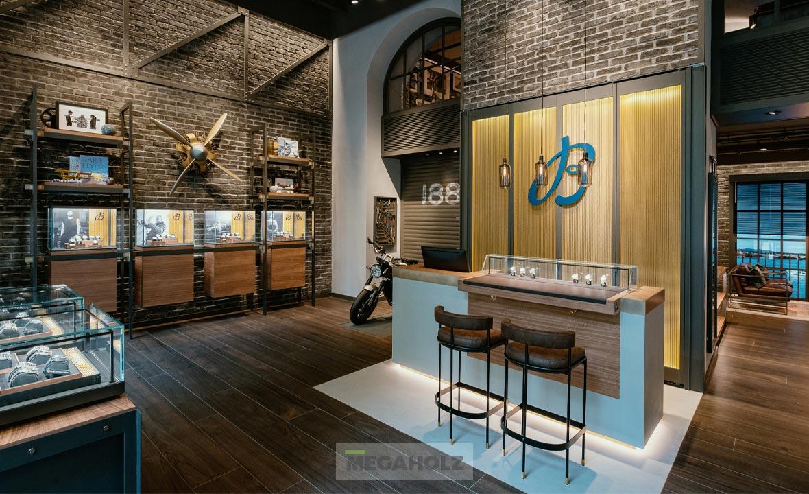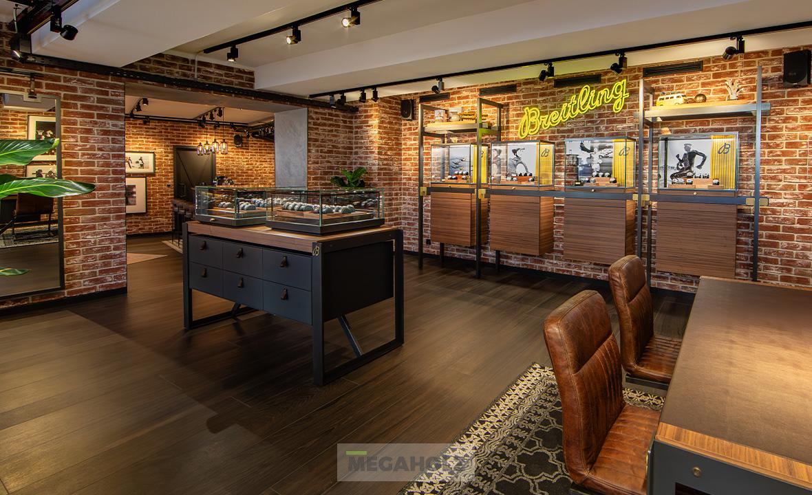 A legújabb salzburgi Breitling Boutique megvalósításához csapatunk is hozzájárult. A közel 160 négyzetméteres üzletbe belépve a vásárlók egyedülálló designnal találkozhatnak: kifinomult légkörrel és az ipari loftok kortárs értelmezésével. A Megaholz az egyedi bútorzatot szállította az üzletbe: a szabadon álló és fali vitrineket, polcokat, asztalokat és az egyeid bárpultot.