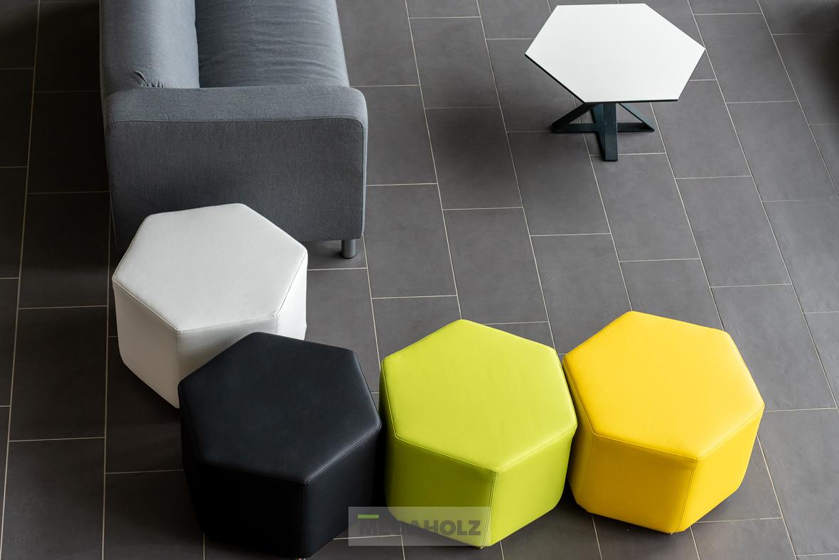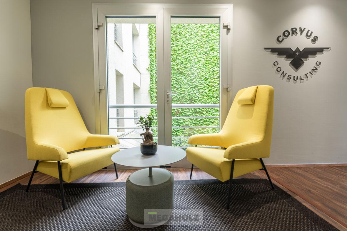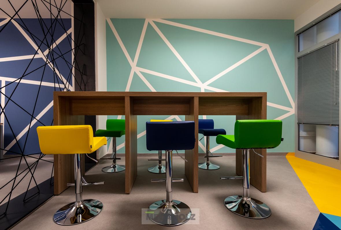 A kényelem és a design mellett az is fontos szempont volt, hogy mindkét cég arculatának színvilága visszaköszönjön a bútorok megjelenésén.