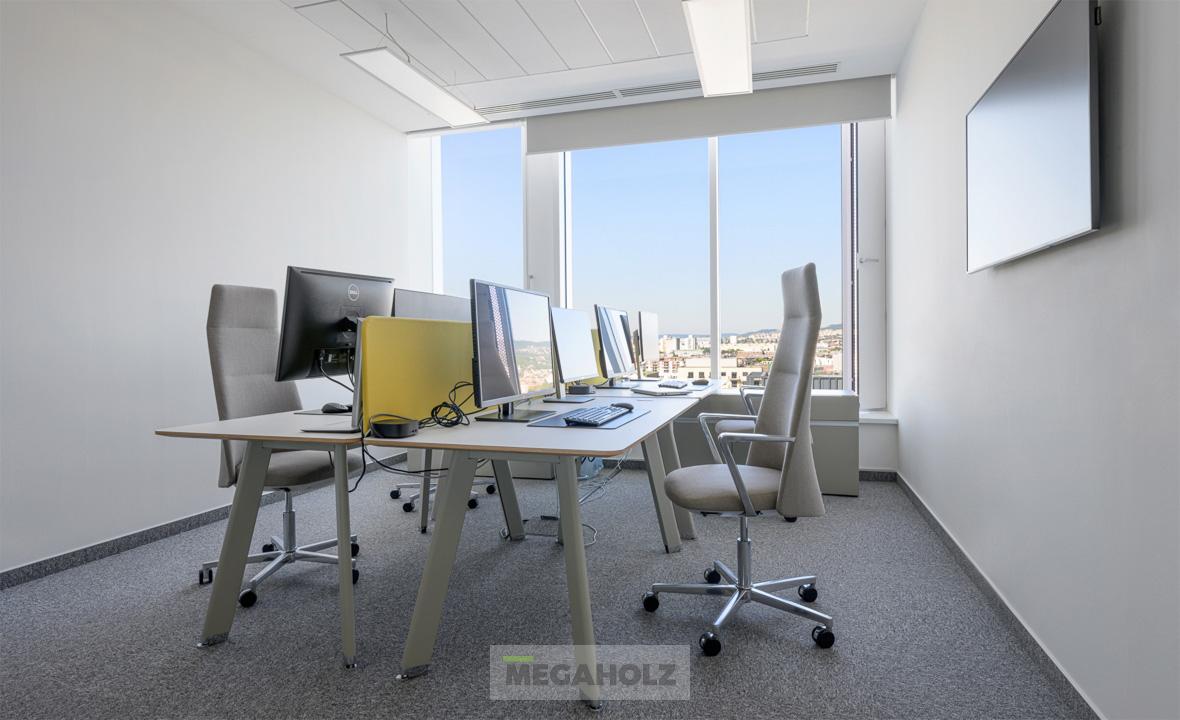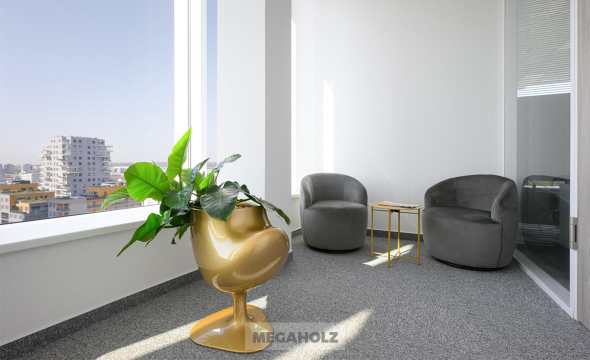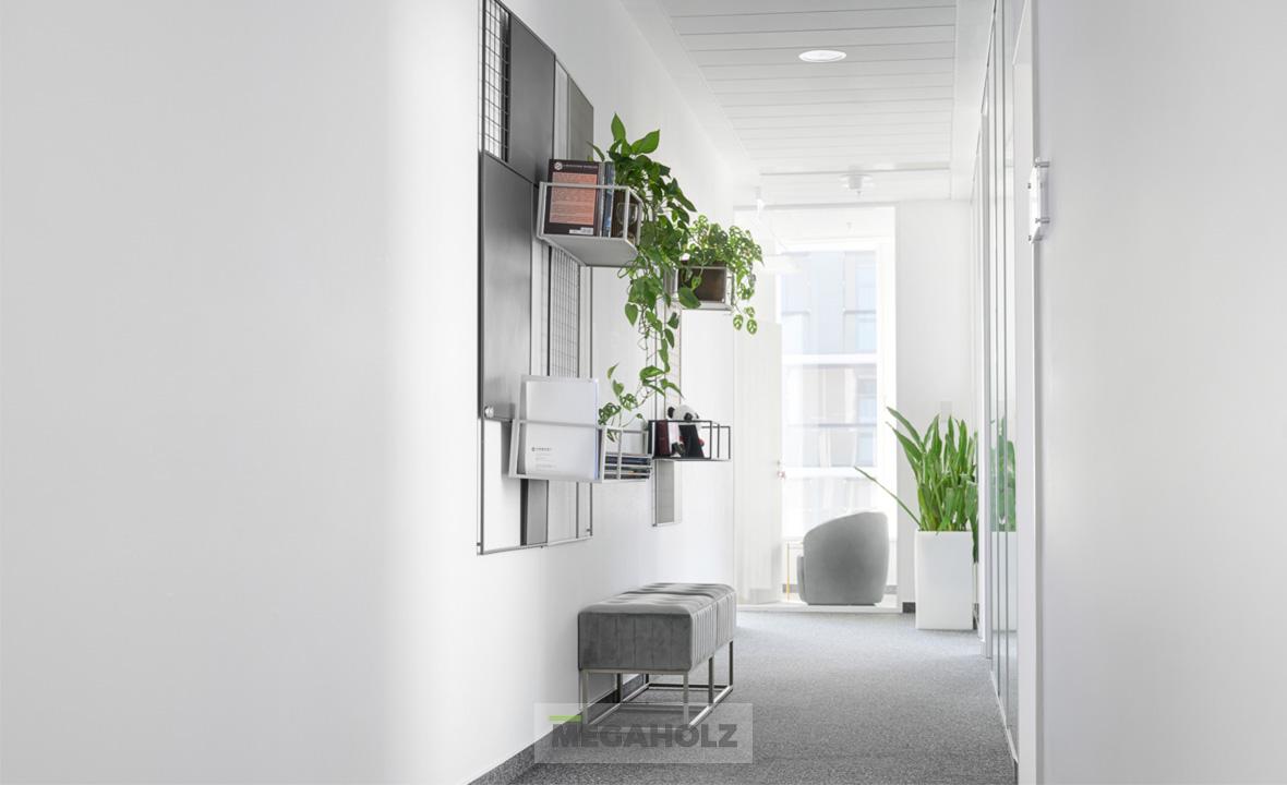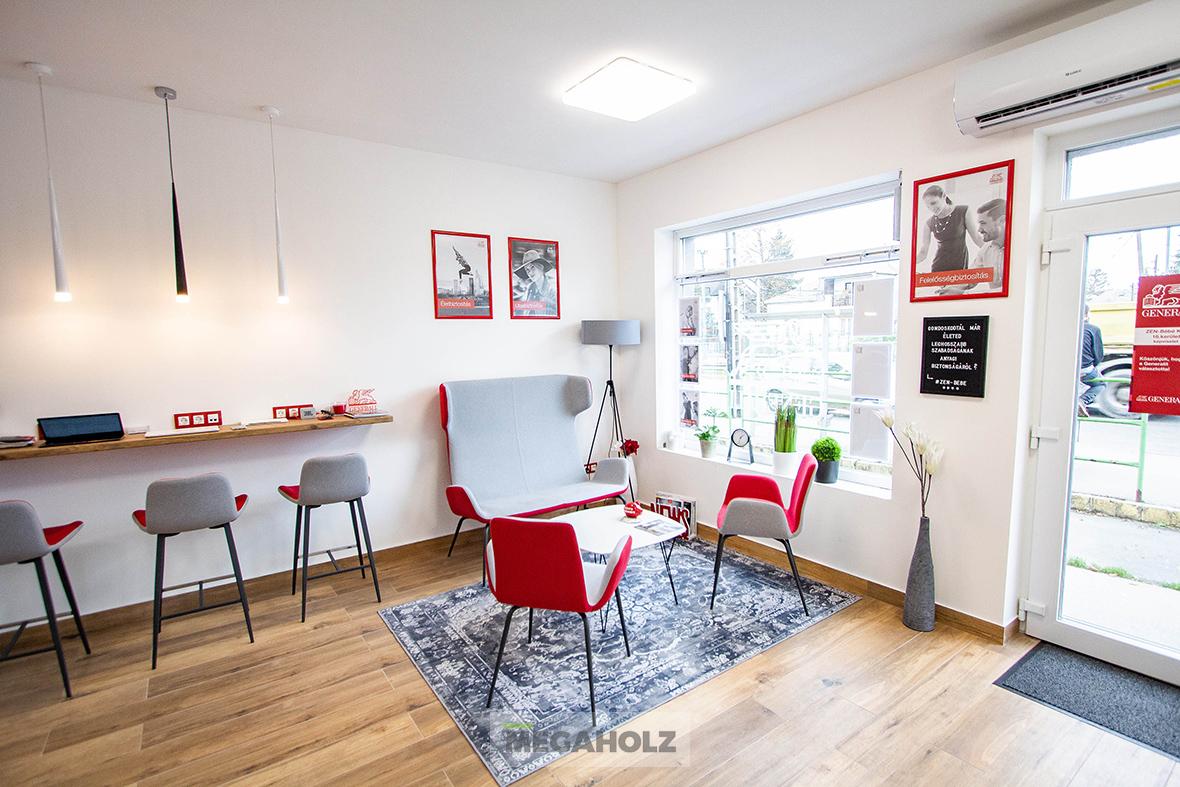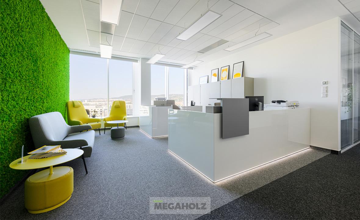 Vadonatúj iroda a BudaPart Gate-ben! A 315 négyzetméteren elterülő iroda egyik csodás különlegessége a zuzmó design fal. A Megaholz csapata gondoskodott az ergonomikus dolgozói és vezetői székekről, valamint a lounge leülőkről is, amik a kényelmet szolgálják. Az iroda berendezését teljessé tettük az asztalokkal, az irattároló szekrényekkel és az egyedi recepció pulttal.