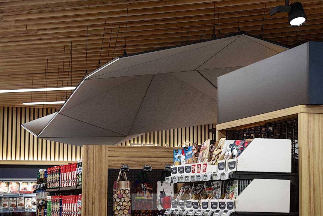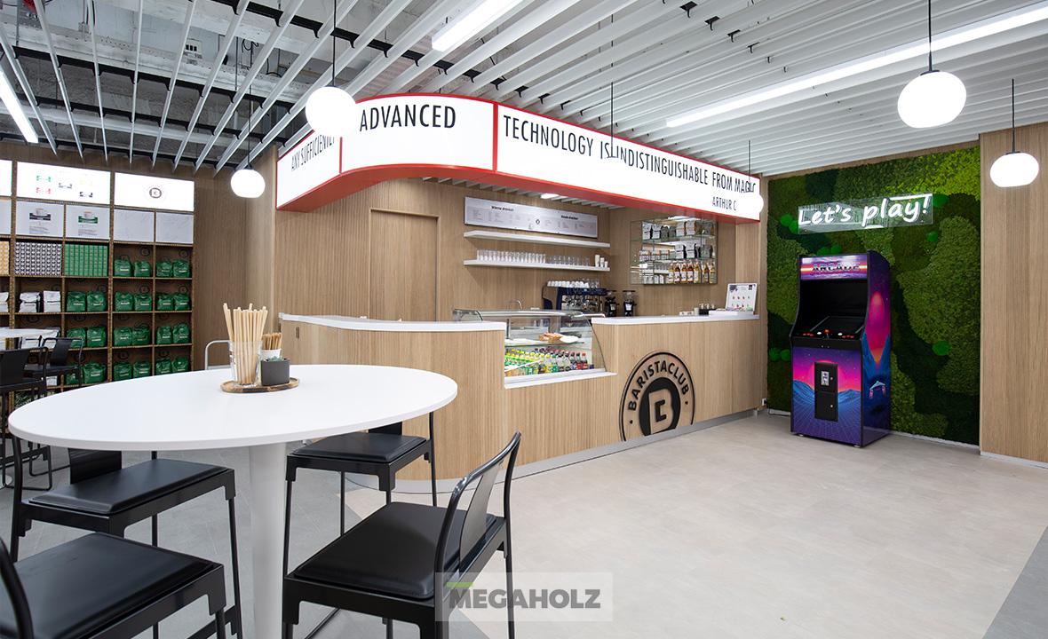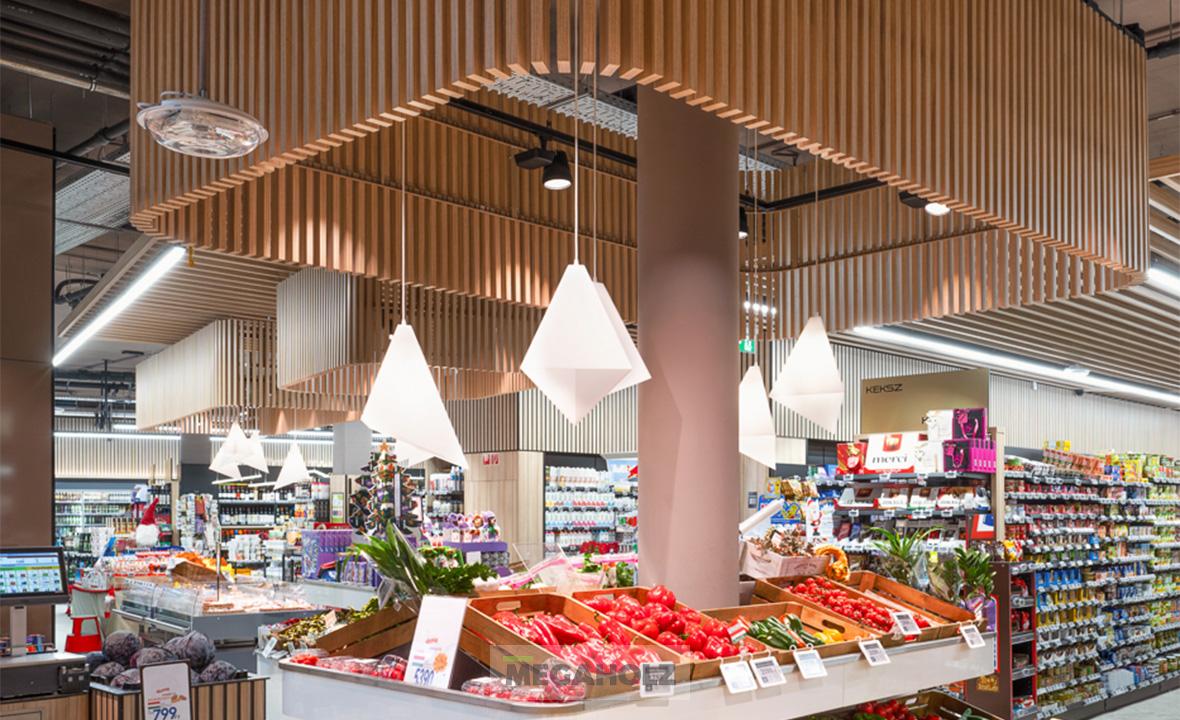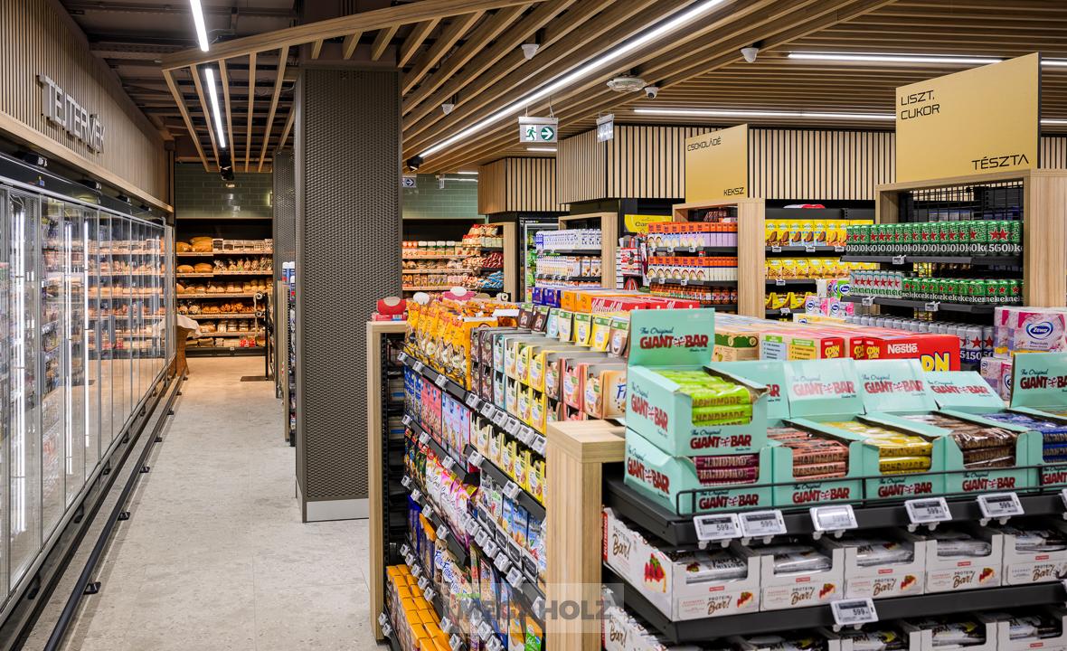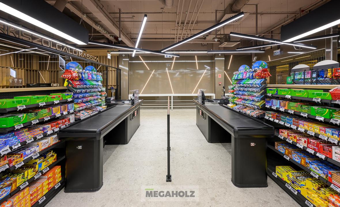 A CBA Linum üzletben egyedileg gyártott üzletberendezési megoldásainkkal járultunk hozzá a színvonalas megjelenéshez. A falburkolatokon, optikai álmennyezeteken, kasszapultokon, design feliratokon és polcrendszereken kívül az üzlet világítását is a Megholz biztosította.