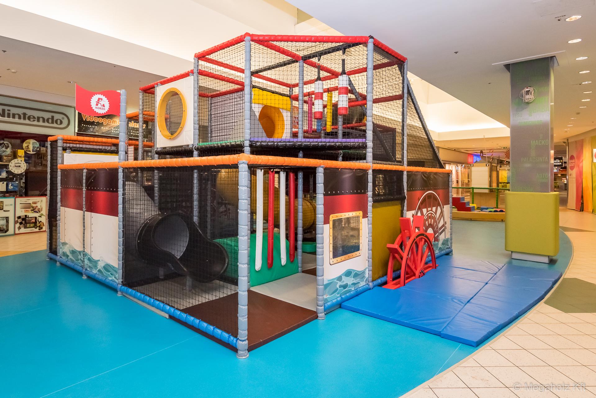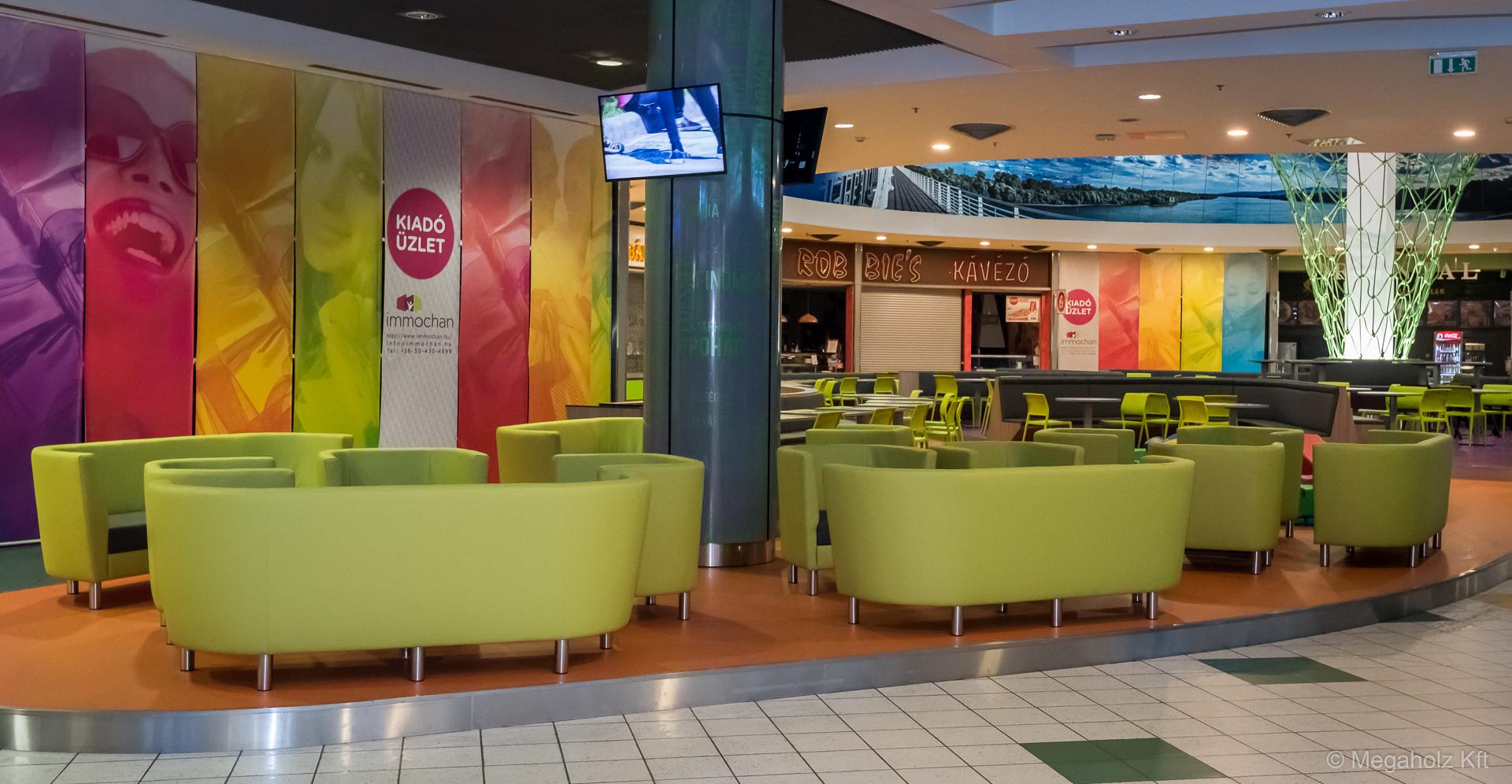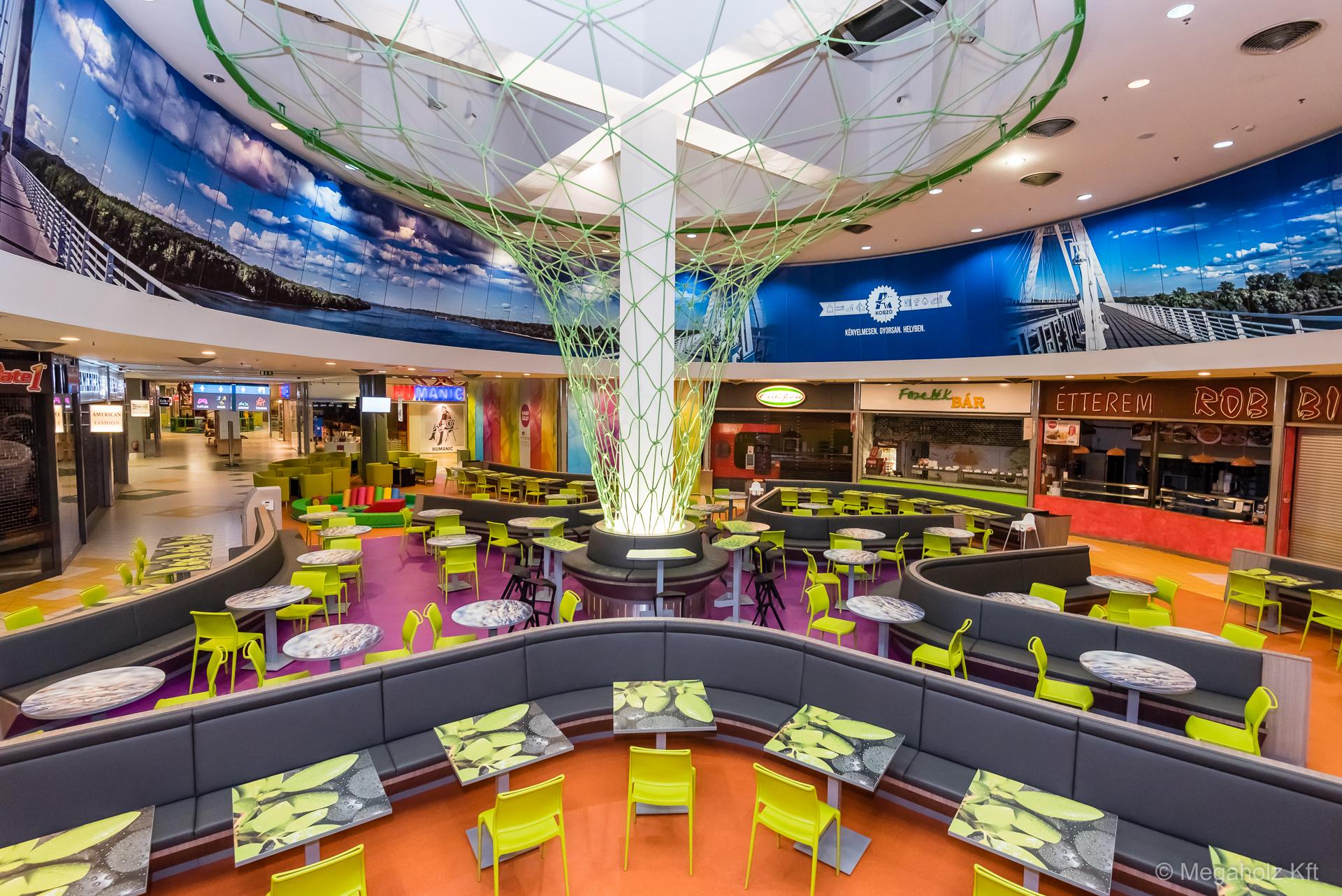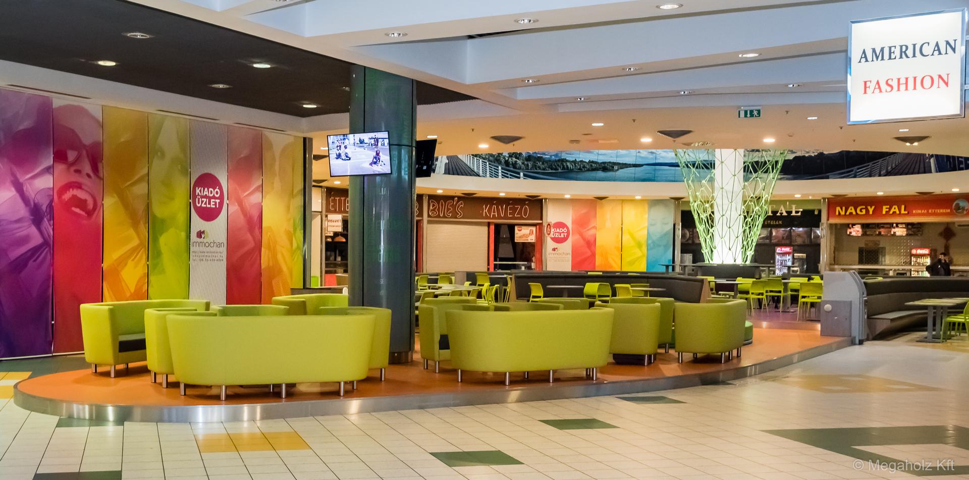 Egy bevásárló központ étel udvara Budapesten.