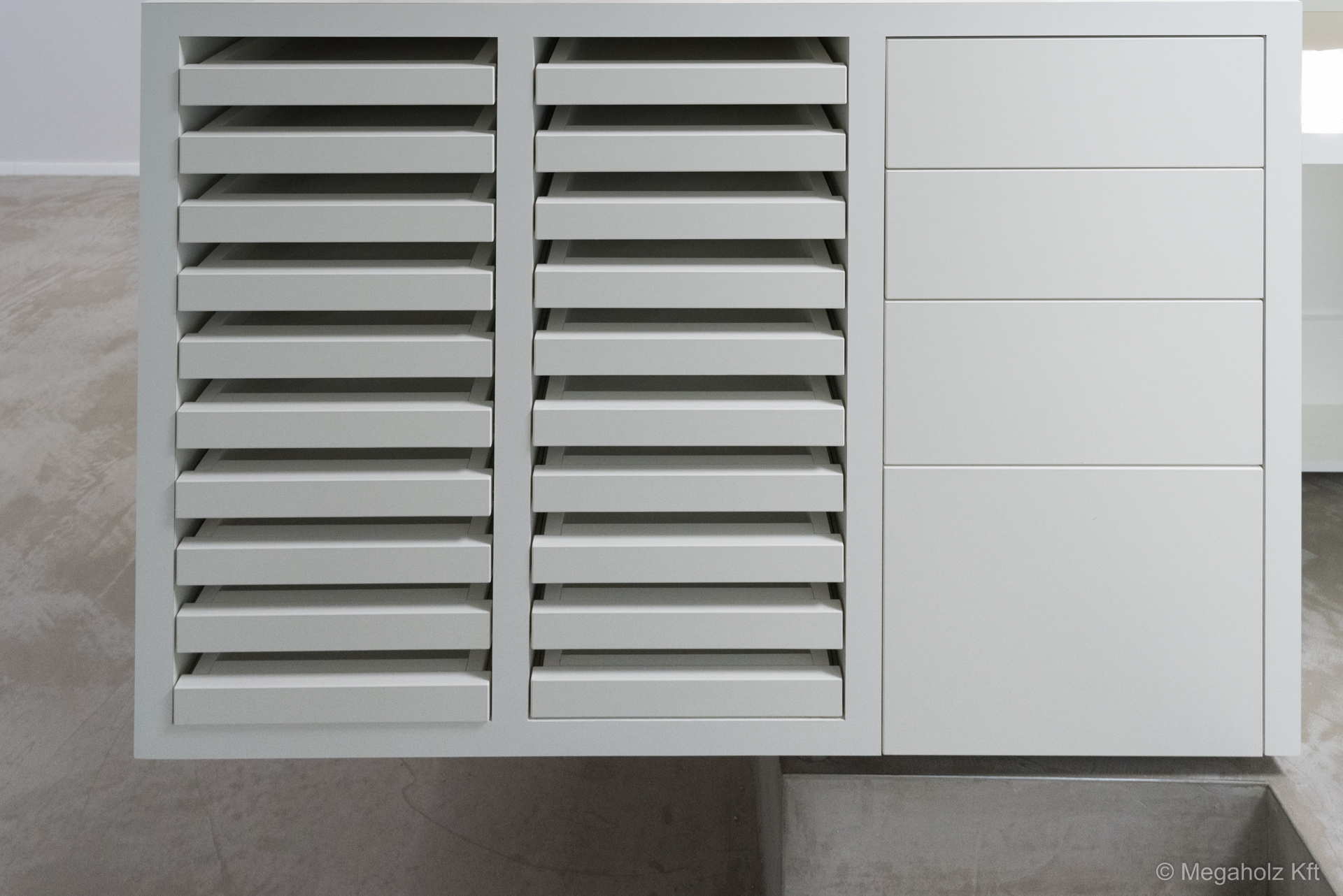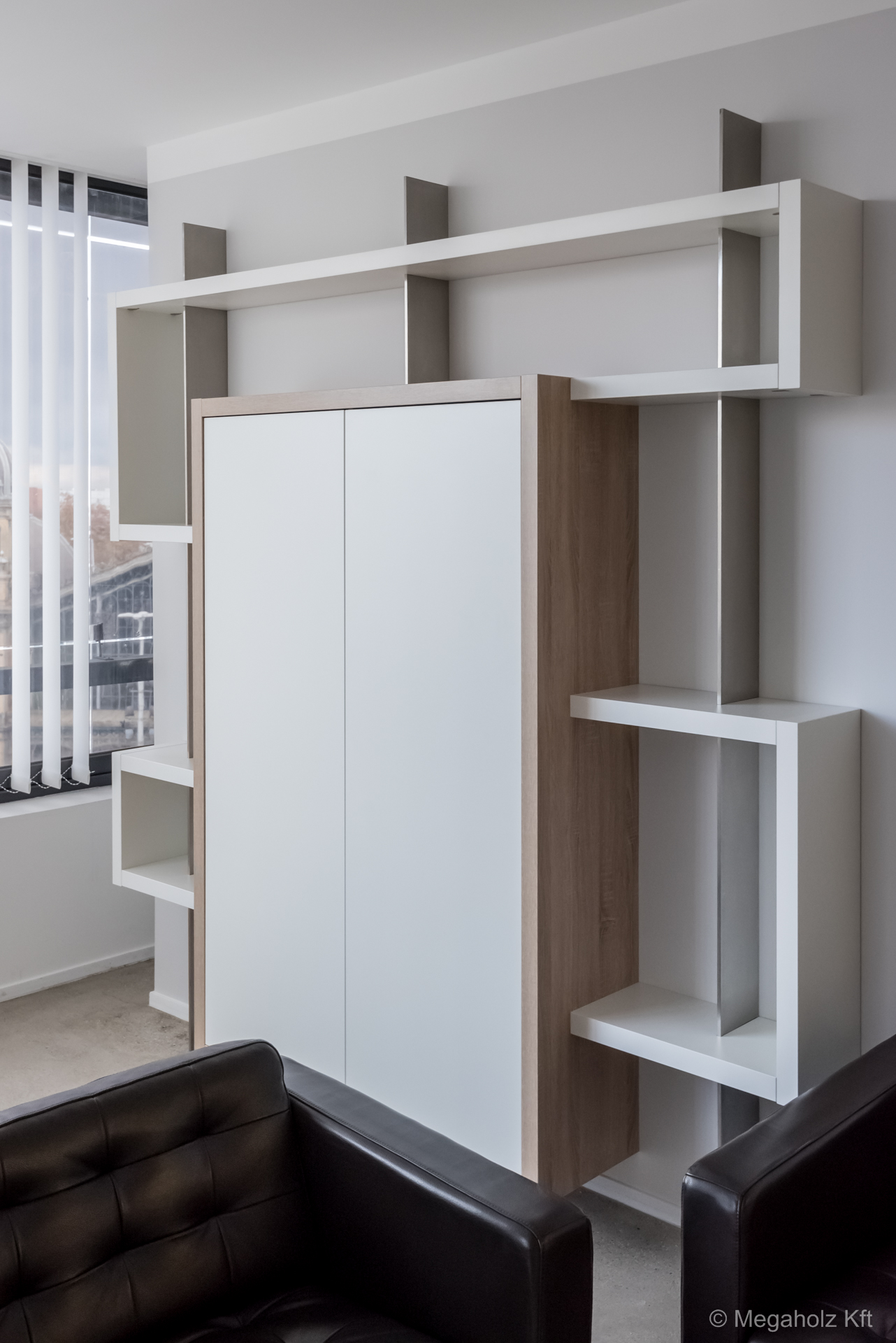 Legújabb projektünkben mi gondoskodtunk az irodák, a konyha és a tárgyalóterem bútorzatáról is, beleértve az egyedi és mobíl bútorokat a mohadekorációk mellett. A tárolásról sem feledkeztünk meg, az egyedileg készített szekrényeink gondoskodnak a rendezett környezetről és a stílusos megjelenésről.