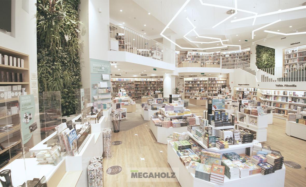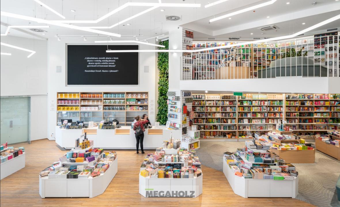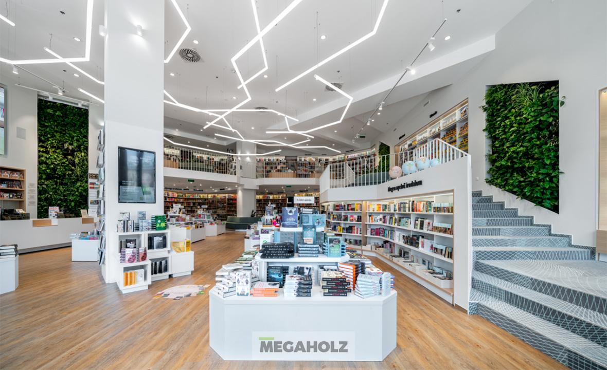 Már sok éve mi látjuk el a Libri üzleteit egyedi készítésű bútorainkkal. Az üzlet tágas és világos teret kínál a több mint 6 méteres belmagasságának köszönhetően, miközben megtartja az otthonos és barátságos atmoszférát. Csapatunk az egyedi kanapékat, polcokat, szekrényeket és faburkolatokat szállította.