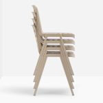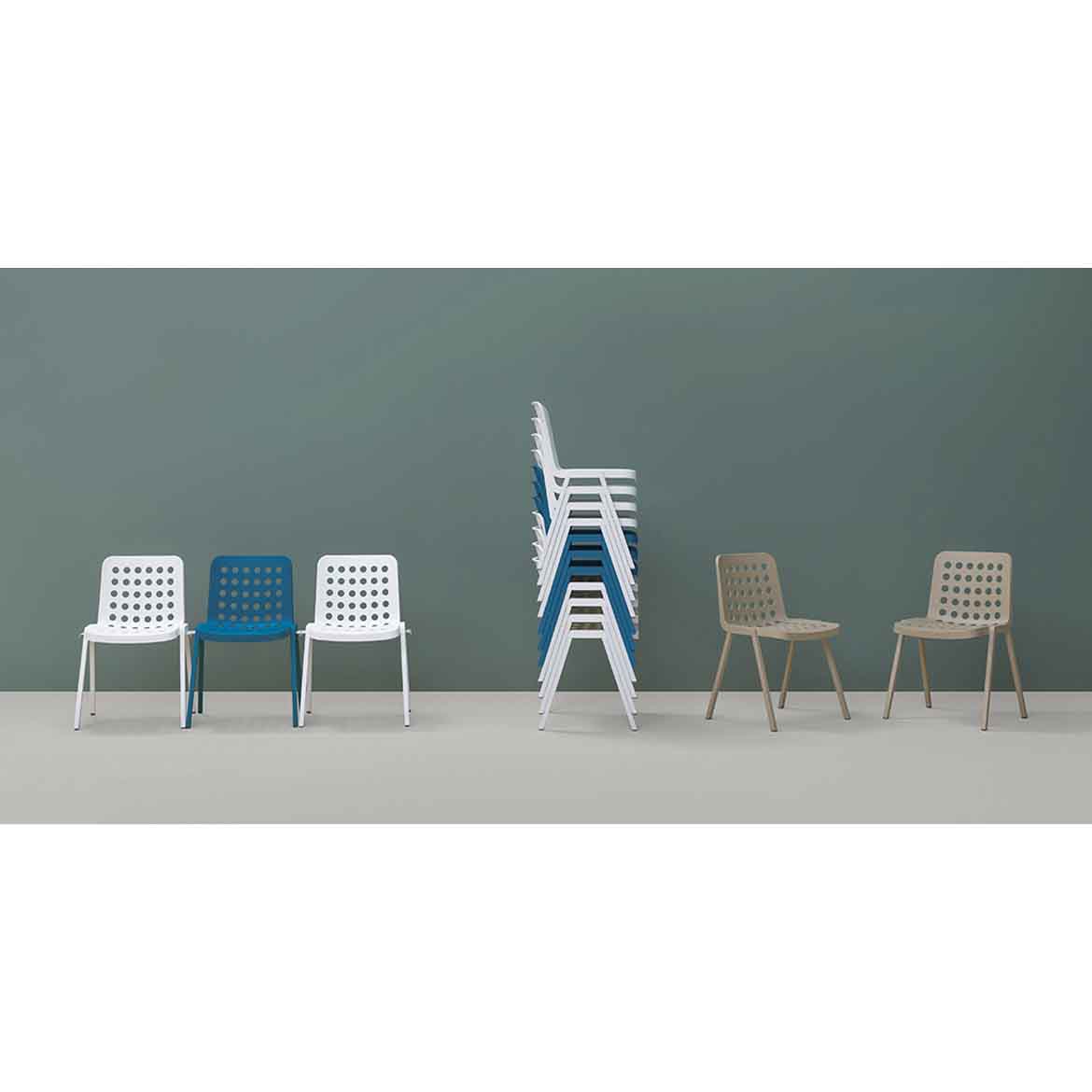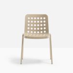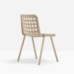 Polipropilén szék, 100%-ban újrahasznosítható, öntött polipropilén burkolat, préselt alumínium lábak és a váz öntött alumíniumból készült. Az ülés elérhető fehér, bézs, narancssárga, fekete vagy kék színben egy hozzá illő porszórt burkolattal. Gyártó: Pedrali. Tervezők: Claudio Dondoli & Marco Pocci.