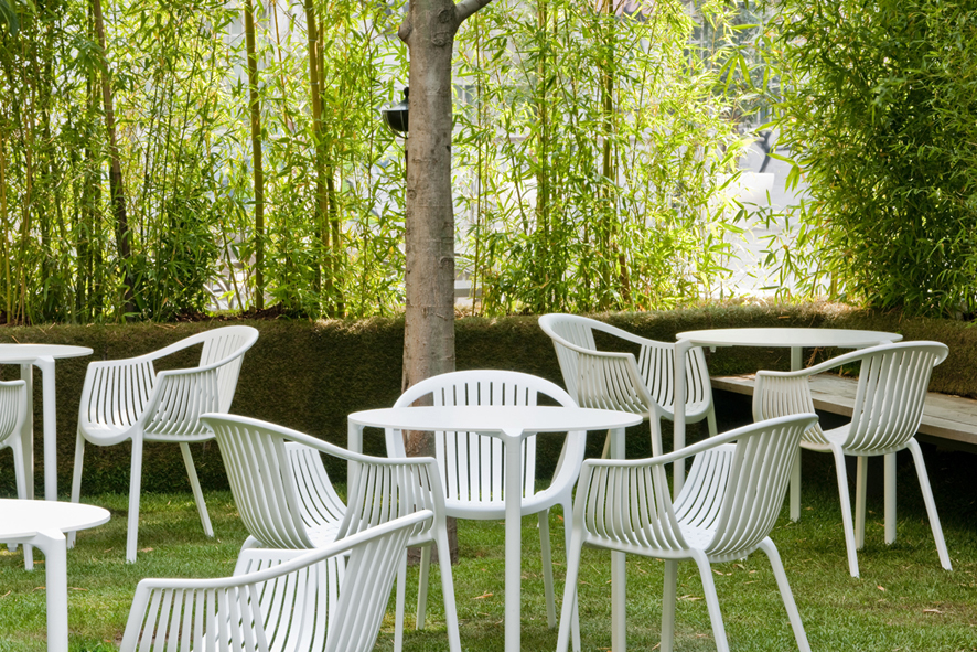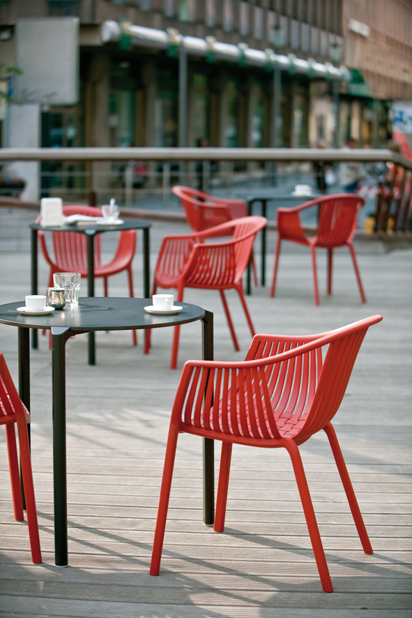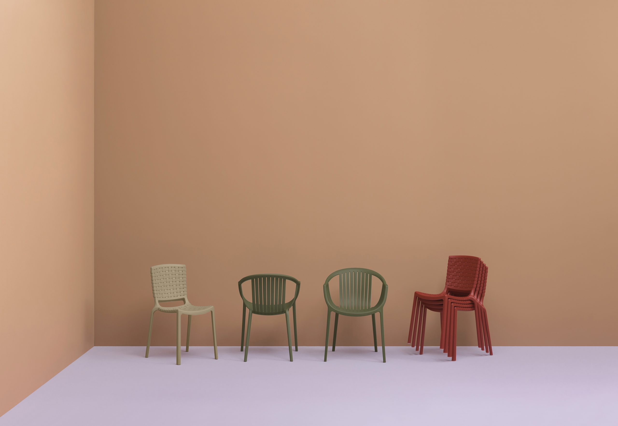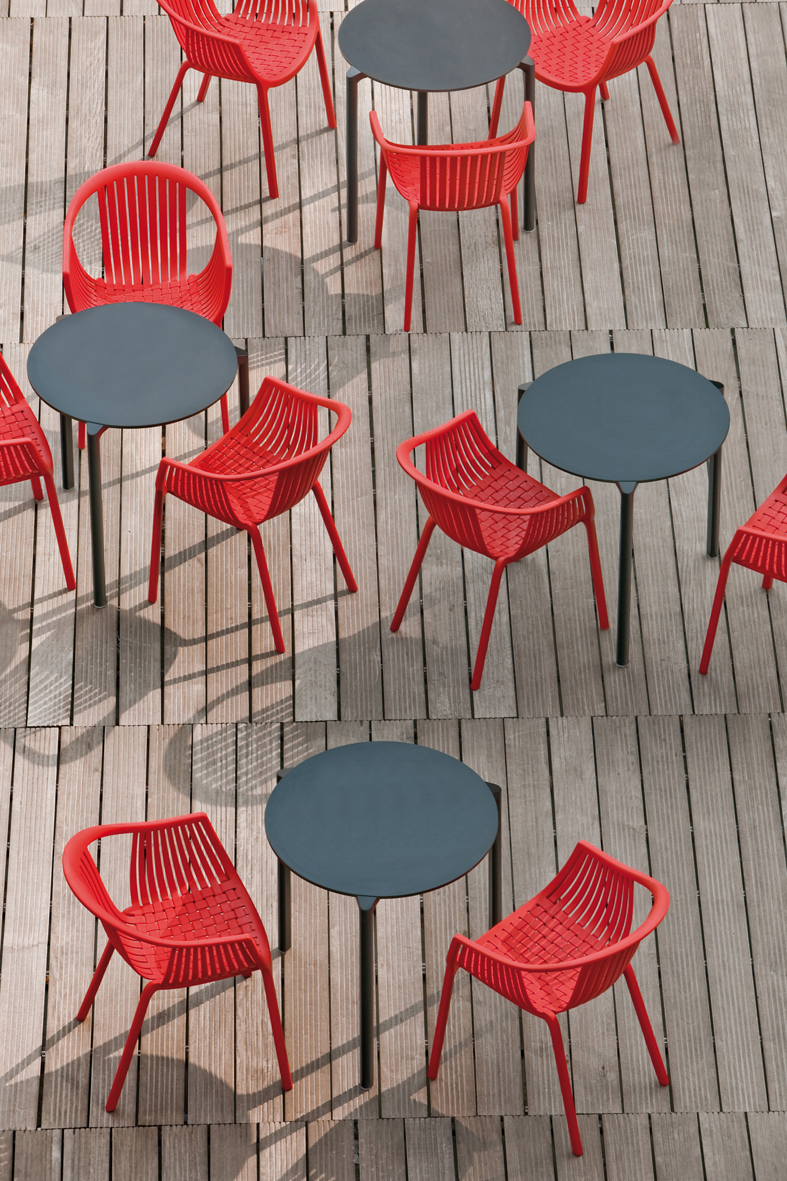 Tatami collection expresses desire to live at open air. The peculiar weaving of the shell guarantees comfort and encourages relax. Gas assisted injection moulding polypropylene armchair, charged with glass fibers. Stackable up to 6 pcs.